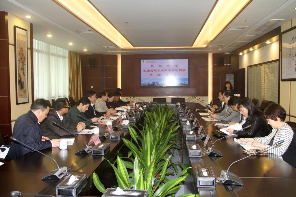 3月31日,常州信息职业技术学院党委书记邓志良、副校长费云生一行来我校交流。我校夏伟校长,党办校办、党委宣传部、学生工作部、后勤管理处、图书馆等相关部门负责人热情接待了来宾。
