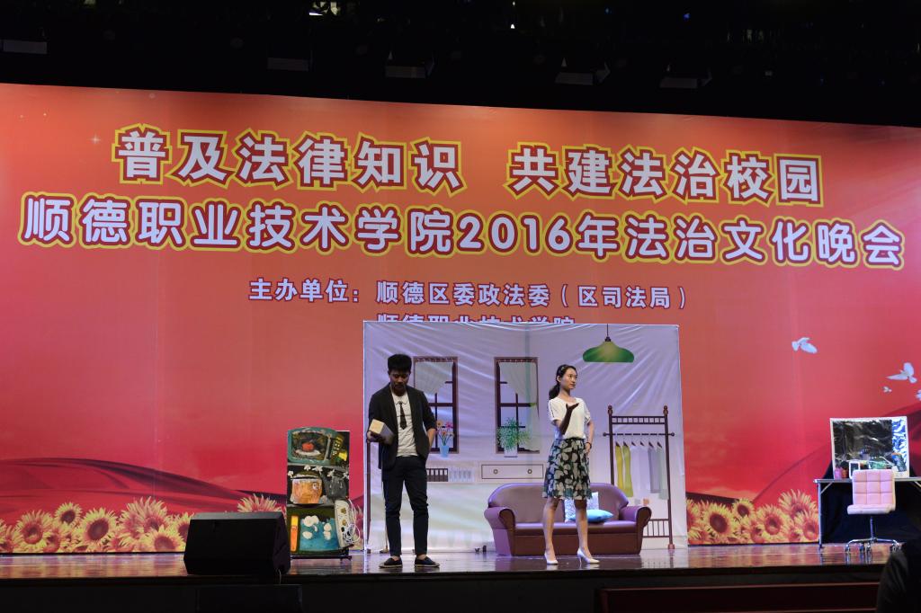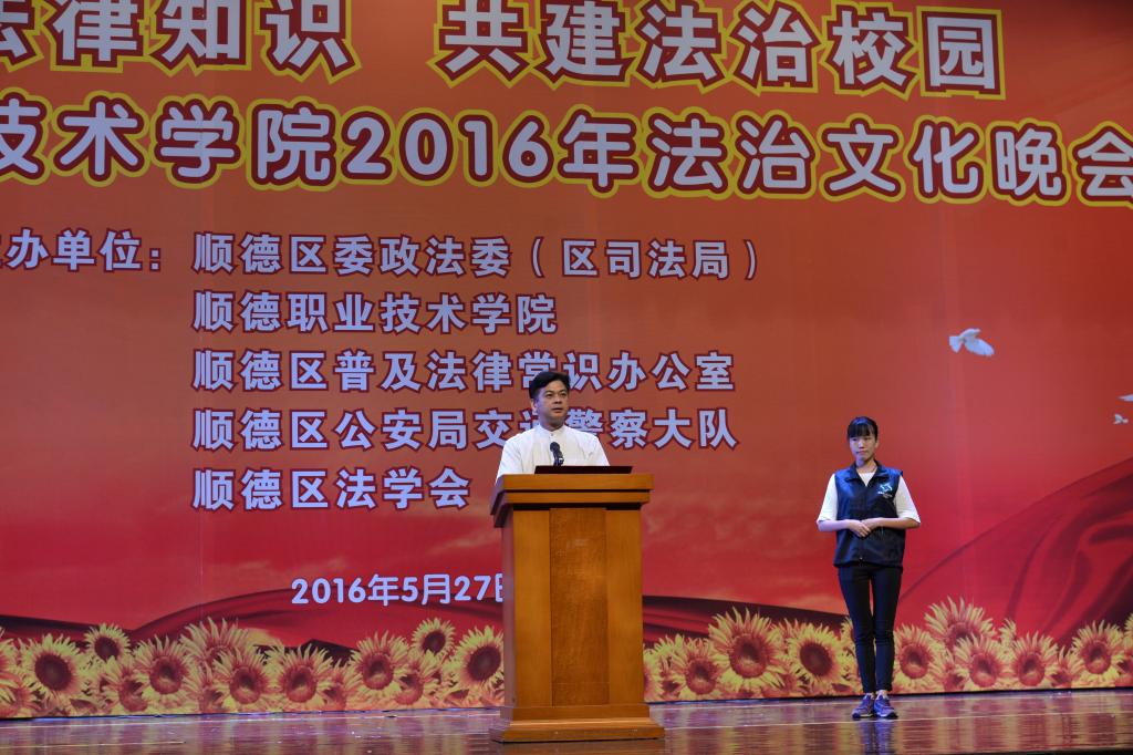 5月27日晚,我校与顺德区委政法委(区司法局)、顺德区普及法律常识办公室、顺德区公安局交通警察大队、顺德区法学会在梁銶琚礼堂联合举办以“普及法律知识 共建法治校园”为主题的顺德职业技术学院2016年法治文化晚会,以小品、千人有奖竞答等形式让师生学习法律知识和学校章程。顺德区委副书记、区委政法委书记陈浩斌,顺德区委政法委常务副书记卢英伟、顺德区司法局副局长冯炳全等领导莅临本场晚会。学校党委副书记、副校长刘毓,学校纪委书记谭谦章,相关部门负责人及各二级学院辅导员、学生代表共一千余人参加了晚会。