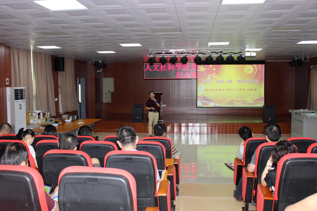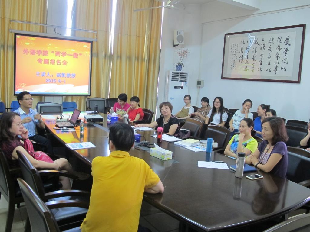6月1日下午,外语学院“两学一做”专题报告会在教学楼3栋501举行。报告会由外语学院党总支书记魏藏锋主持,邀请了我校“两学一做”讲师团成员、校党委宣传部汤恺部长作题为“认真学习党章增强党章意识 做有信仰的党员”专题讲座。外语学院全体教工党员、学生党员出席了本次活动。
