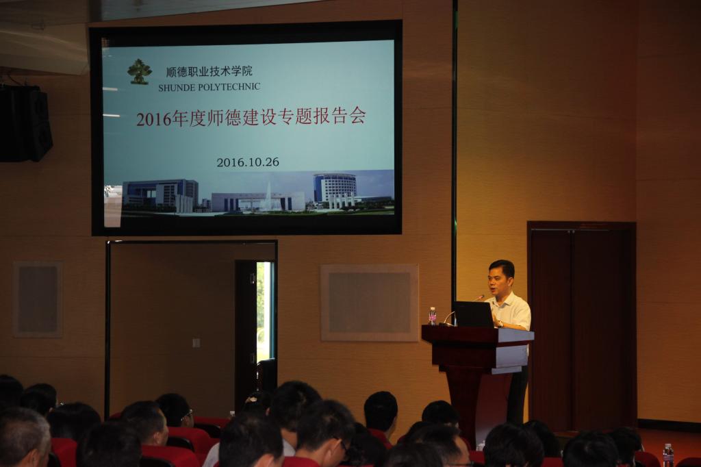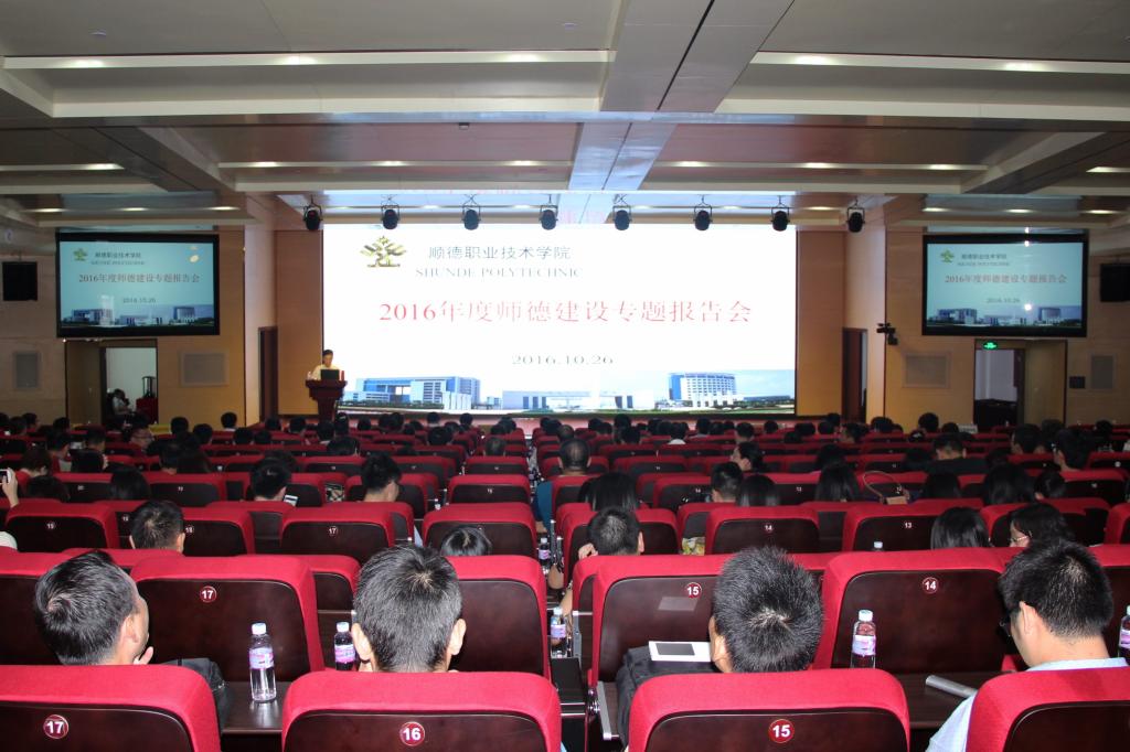 为在我校教师队伍中广泛形成“甘守三尺讲台,争做‘四有’老师”的崇高师德风尚,继续坚持以“爱岗敬业、教书育人”为核心,以“不忘初心、继续前进”为思想动力,以“有理想信念、有道德情操、有扎实知识、有仁爱之心”为根本要求,进一步引导教师树立正确的职业道德、职业理想与职业信念。10月26日,我校邀请了全国教书育人楷模,全国模范教师、广东水利电力职业技术学院林冬妹老师来我校开展“2016年度师德建设专题报告会”。学校领导刘毓、谭谦章,番禺职业技术学院、中山职业技术学院教师代表以及我校教职工共400余人参加了报告会。报告会由学校党委副书记、副校长刘毓主持