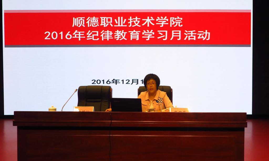 根据党的十八届中央纪委六次全会、省纪委十一届五次全会的工作部署,按照省委、省纪委、佛山市、顺德区关于2016年开展纪律教育学习月活动的部署,结合学校的工作实际,我校于12月14日召开了2016年纪律教育学习月报告会,报告会邀请了顺德区审计局总审计师张碧芬、顺德区审计局固定资产投资审计科科长陈锡均作专题讲座。学校领导夏伟、刘毓、齐振彪、陈粟宋、谭谦章,以及部门科室、教研室副职以上干部、全体教工党员、财务处全体人员、后勤管理处相关人员、学校二级财务共计400余人参加了会议。大会由学校纪委书记谭谦章主持。
