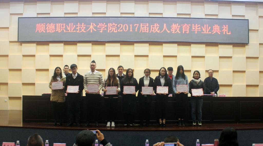1月15日上午,我校在学术交流中心隆重举行顺德职业技术学院2017届成人教育毕业典礼。我校徐刚副校长,继续教育学院、广东创业培训学院相关负责人,容桂职业技术学校、均安职业技术学校、龙江职业技术学校、广东顺德创业培训学院的老师和各班主任、继续教育学院全体老师和2017届成人教育毕业生出席了毕业典礼。