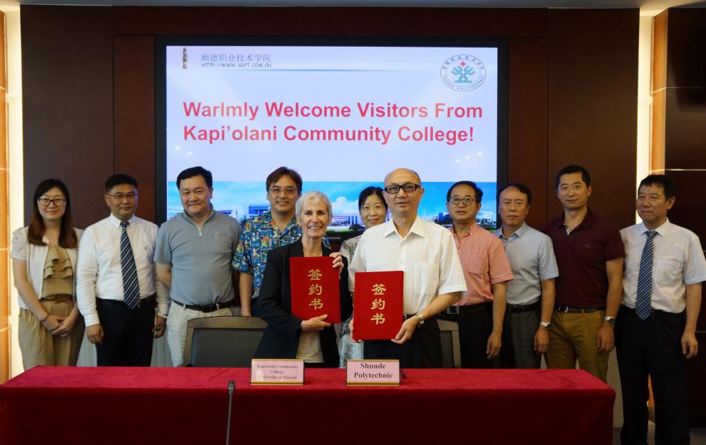 2017年6月22日,美国夏威夷大学卡皮欧拉尼社区学院(KAPIOLANI COMMINITY COLLEGE)校长Louise Pagotto女士、国际部主任冯赛源先生在广东省侨办文化教育处调研员沈卫红、副主任科员严力为,顺德区外事侨务局黄建雄局长、卢颖琪副科长的陪同下,一行来访我校并签署合作备忘录。我校副校长徐刚,学校顾问杨铭铎、国际交流与合作处负责人、经济管理学院负责人、酒店与旅游管理学院负责人、顺德圆方社企谢英辉总经理及我校相关教师参加了洽谈签约和互动交流活动。