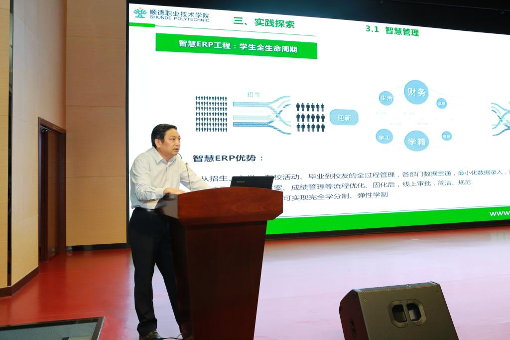 随后,ERP项目组周俪老师针对本学期已上线的ERP学生全生命周期管理系统进行了主要功能介绍与演示。我校国家级专业教学资源库制冷专业团队余华明老师,从专业教学资源库的建设与应用、依托资源库建设发展智慧教学等两方面进行了经验分享和交流。