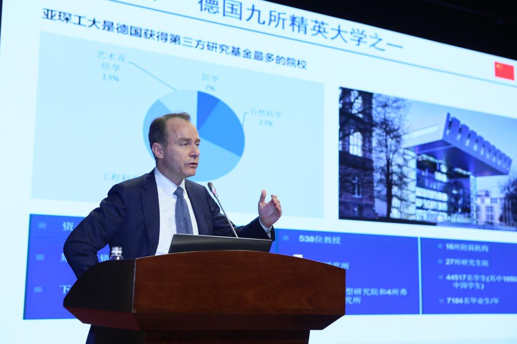 亚琛市市长代表Frank Leisten先生介绍了亚琛市及亚琛工大在工业4.0技术研发、应用等方面与企业合作的案例,提供了与亚琛潜在的合作伙伴信息,并欢迎顺德企业与亚琛市开展各种技术交流与合作。