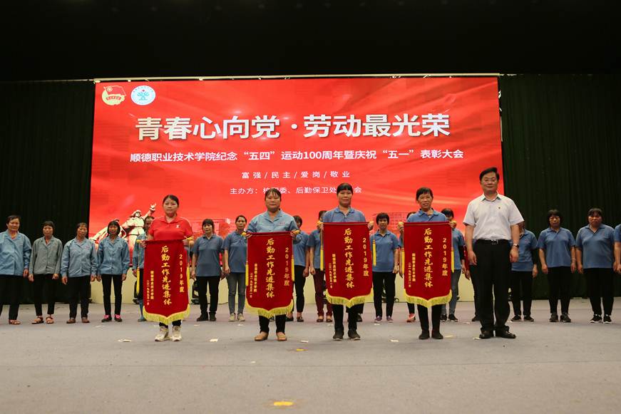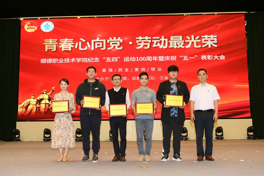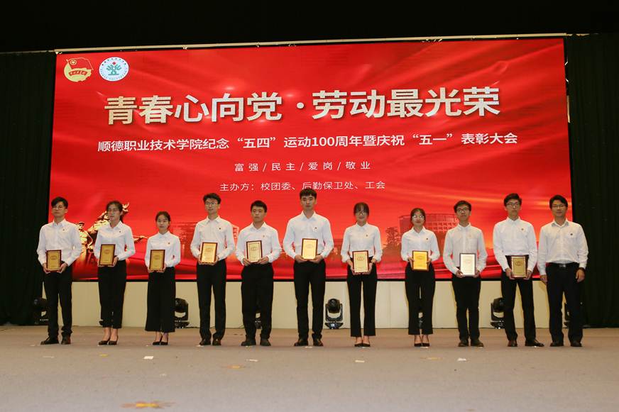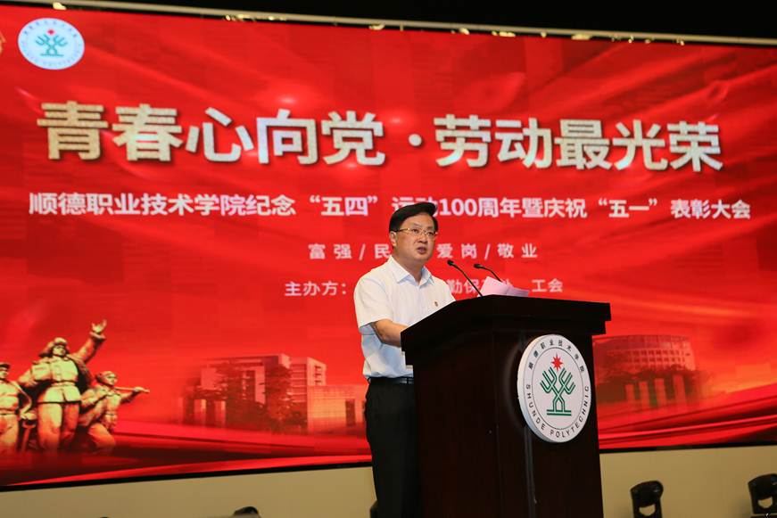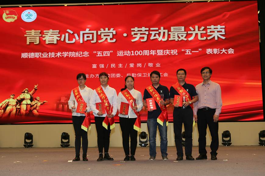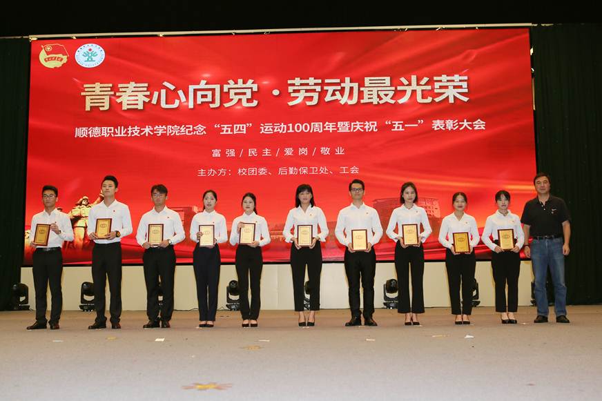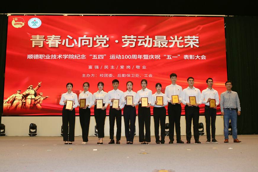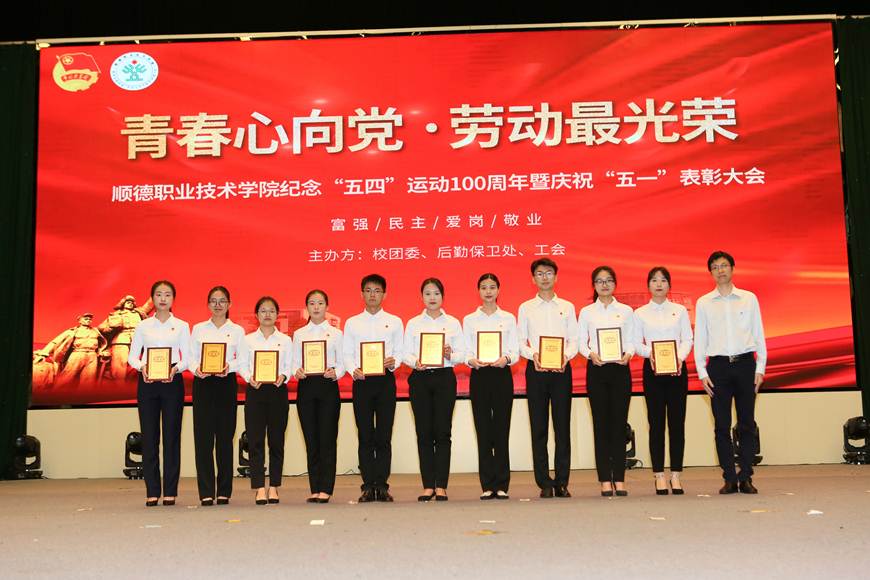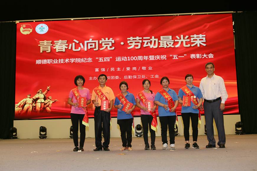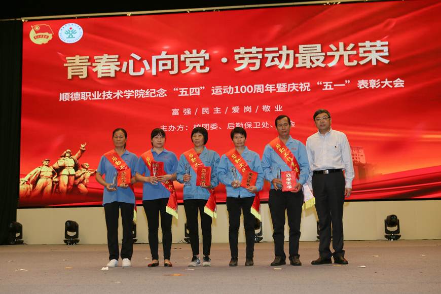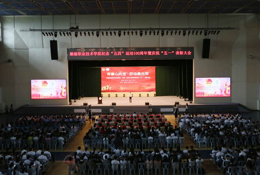 5月6日下午,我校在梁銶琚堂隆重举行“青春心向党·劳动最光荣”纪念“五四”运动100周年暨庆祝“五一”表彰大会。顺德团区委副书记曾浩宇,学校领导夏伟、刘毓、谭谦章、陈粟宋、黄健光,学校党委委员、学工部、校团委、工会、后勤保卫处、各二级学院、顺大公司、鼎瀛公司主要负责人,校团委、各二级学院团学老师,后勤工作者代表以及青年团员共计1500多人参加了活动。