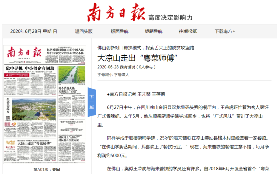 6月28日,《南方日报》头版推出报道《佛山创新对口帮扶大凉山走出“粤菜师傅”》,对我校以“粤菜师傅”工程为突破口,创新对口帮扶,探索舌尖上的脱贫攻坚方案进行了深度关注。