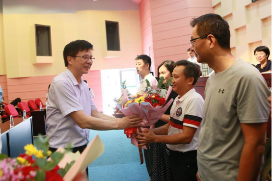 学校党委书记李先祥为满30年教龄的老师献花