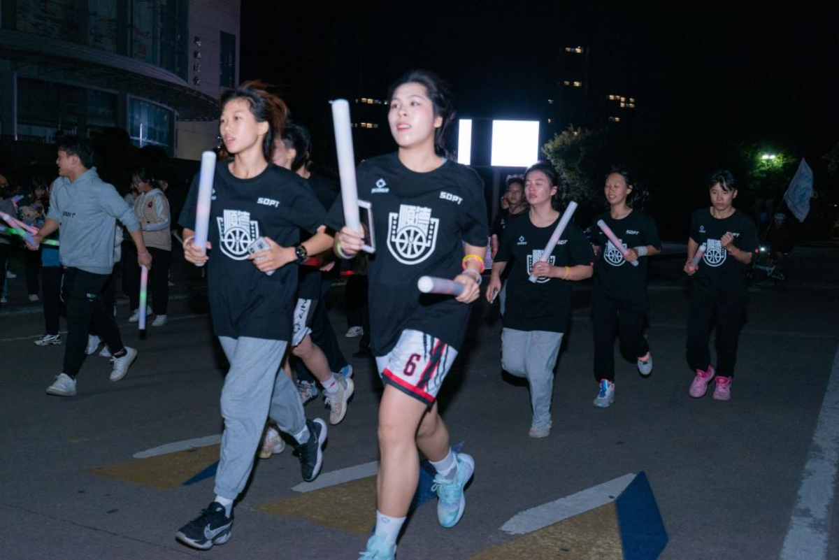 荧光醒狮迎冬奥,顺职学子唱《奔跑》。校学生模特队运动健康主题的走秀,展现出顺职学子的青春气质,师生们一起挥动荧光棒,现场气氛热烈。随着校团委书记王晓宣布开跑,自行车协会、轮滑协会的同学们高举校旗在前面带路,师生们紧跟其后环着碧桂园湖开始了荧光夜跑。