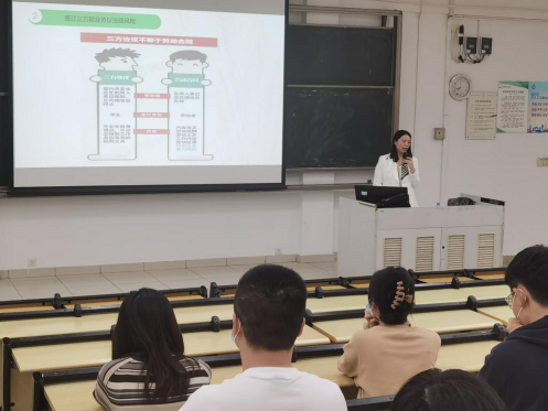 “大学生就业权益保障与法律风险防范”主题讲座由广东正帆律师事务所的包红先律师主讲。包红先针对大学生就业法律知识匮乏、维权意识淡薄、社会经验不足,容易被侵犯权益的等问题,结合真实案例讲解就业过程中所涉的法律法规,指导大学生们识别求职就业中常见的合同陷阱、试用期陷阱、信息陷阱、传销陷阱、押金陷阱等,同时分享了创业过程中的法律风险及预防方法,提高同学们的法律意识。包红先表示,毕业生除了应当掌握专业技能,还要注意提高法律素养;步入社会后,要意识到诚信的重要性,明白法律保护的是包括自己在内的自然人、法人和其他社会组织等所有社会活动参与主体的合法权益,决不可心怀侥幸。她建议学校加强法律教育,提高学生诚信意识,告知学生违法风险,提高学生综合素养,为社会输送更多优质人才。