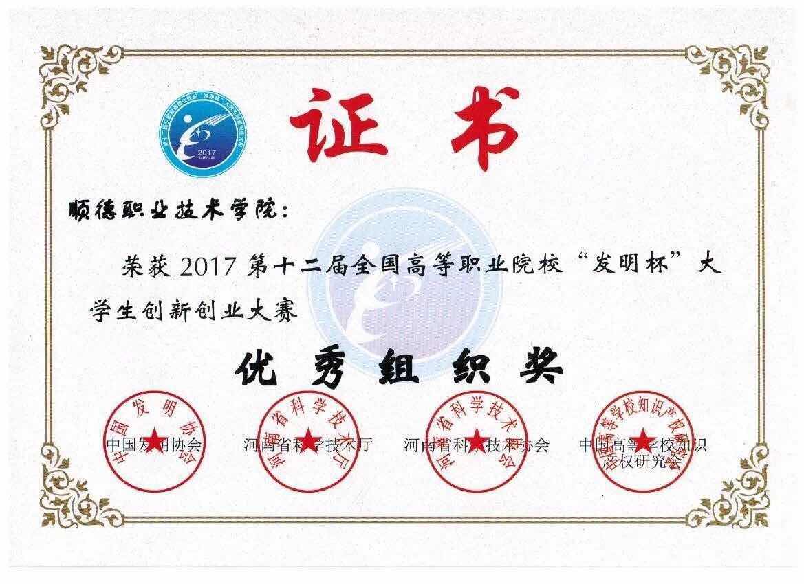 2017年10月25至27日,由中国发明协会、河南省科学技术厅、河南省科学技术协会、中国高等学校知识产权研究会联合主办的第十二届全国高等职业院校“发明杯”大学生创新创业大赛决赛在河南省许昌职业技术学院举行。我校代表团在本届大赛中荣获全国一等奖4项、二等奖11项、三等奖7项。我校陈万武、冯才敏、张立荣、廖翠玲、符茂、肖娜、顾宇清、魏锡坤、黄健光、朱颖等10位老师获“全国优秀指导老师”称号;张业华、刘锦鑫获“全国组织工作先进个人”称号。我校还获得大赛首次设立的“全国高等职业院校双创先进工作单位”称号(全国仅十所学校),和大赛“优秀组织奖”。