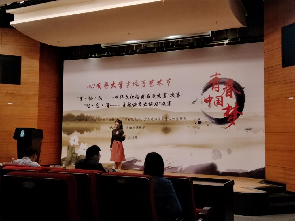 本次活动为深入学习宣传贯彻党的十九大精神和习近平总书记关于青年成长的重要讲话精神,积极响应中共中央办公厅、国务院办公厅印发的《关于实施中华优秀传统文化传承发展工程的意见》,深化当代大学生对中华优秀传统文化价值内涵的认识,激发高校语言艺术教育工作的创造力和活力,提高大学生语言艺术素养而举办的,分“学·辩·思——中华文化经典品读大赛”和“姓·家·国——主题故事大讲坛”两项子赛事。活动得到了全省各高校的积极响应,初赛有4000多人参与。我校选手在饶晓明、廖乐乐两位老师的指导下,在初赛、复赛中脱颖而出,晋级总决赛,与中山大学、华南师大、暨南大学等高校学子同台竞技,最终取得了优异的成绩。